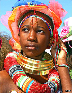 يک مانکن اهل آفريقای جنوبی با لباس سنتی در يک مسابقه مد لباس. اين مسابقه مد لباس در حاشيه رقابتهای سالانه اسب سواری جام "کانن گلد" در آفريقای جنوبی برگزار شد. |