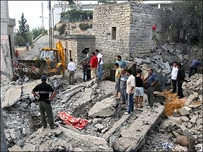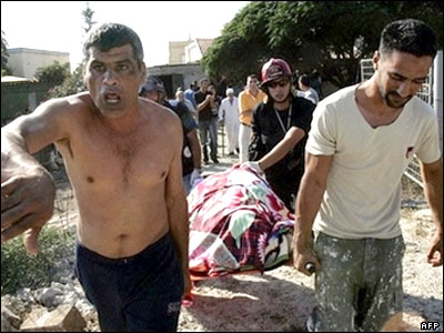 مردان عرب - اسرائيلی، جسد زنی را که بر اثر انفجار موشک حزب الله کشته است حمل می کنند.