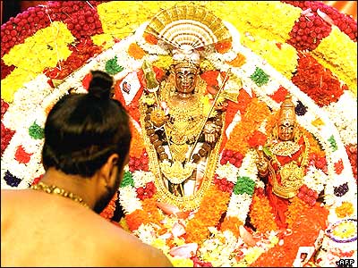 رهبر روحانی آئين هندو در معبدی در کلمبو پايتخت سريلانکا، در فستيوال مذهبی سالانه "رنگ ها" در حال نيايش.