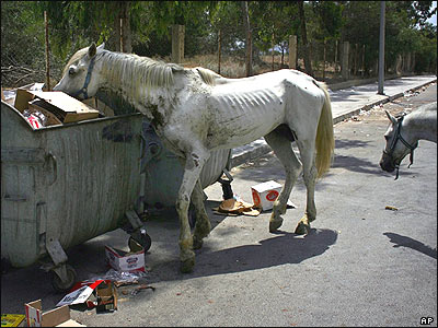 يک اسب گرسنه در حومه شهر صور، جنوب لبنان، در ميان زباله ها در جستجوی خوراک است: جنگ در لبنان حيواناتی را که صاحبانشان به مکان های امن تر فرار کرده اند، آسيب پذير کرده است.
