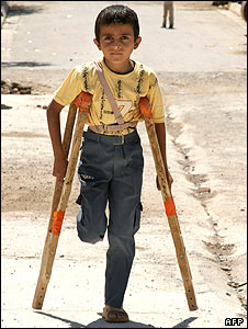 يک پسر کرد در دهکده ای کردنشين واقع در مرز ايران و عراق: ميليون ها مين در اين نواحی که در جنگ ايران و عراق کار گذاشته شده بود همچنان پاکسازی نشده باقی مانده و باعث مجروح شدن عده ای زيادی از اهالی اين مناطق می شود.