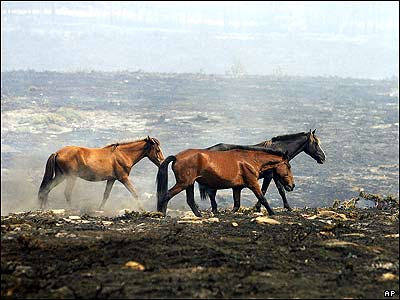 اسب های سرگردان در تورونا، در شمال غربی اسپانيا، قدم می زنند. در آتش سوزی هايی که در هفته جاری رخ داد، حدود 10 هزار هکتار از جنگل های بخش هايی از اسپانيا که به علت دره های زيبايش شهرت دارد، از بين رفته اند.