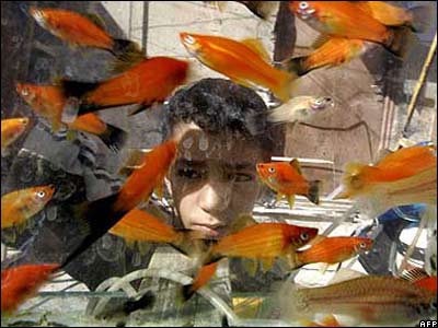 يک پسربچه عراقی در بازاری در مرکز بغداد به آکواريوم خيره شده است. |