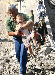 يک خانواده لبنانی در حال ترک خانه شان در شهر صور. گزارشها از دره بقا حاکی از آن است که کاروانی از صدها اتوموبیل حامل مردم جنگزده جنوب لبنان، هدف راکتهای اسراييلی قرار گرفته است. بنا بر گزارشها حداقل شش نفر در اين حمله کشته شده و شمار بيشتری زخمی شدند.