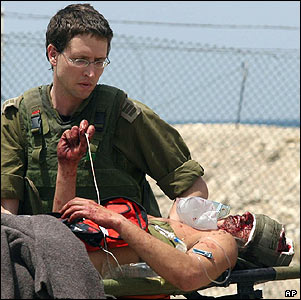 يک سرباز زخمی اسرائيلی در حيفا. با وجود تصويب قطعنامه سازمان ملل برای پايان دادن به جنگ لبنان، اسراييل تهاجم زمينی خود را به جنوب لبنان گسترش داده است.