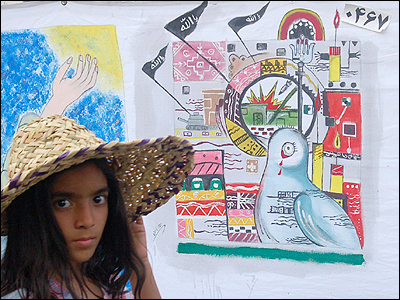 يک دختر بچه در مقابل نقاشی اشپيام صلح