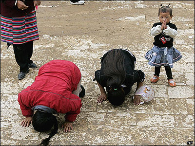 بودائيان تبتی در معبدی در منطقه شانگری لا در شمال غربی چين که در مجاورت مرز تبت قرار دارد.
