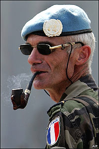 يک سرباز فرانسوی از نيروهای پاسدار صلح سازمان ملل متحد در جنوب بيروت. وزیر دفاع فرانسه گفت به دولت فرانسه گفته شده که نیروهای پاسدار صلح می توانند چنانچه ضروری باشد، برای از میان برداشتن موانع رفت و آمد در جاده ها، به زور متوسل شوند. هرچند وی افزود که خلع سلاح حزب الله وظيفه ارتش لبنان است و نيروهای سازمان ملل در اين امر دخالت نخواهند کرد.