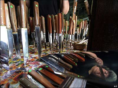 انعکاس چهره يک چاقو ساز بلغار بر روی يکی از خنجرهای شکاری دست سازش در روستايی در شرق سوفيا، پايتخت بلغارستان.