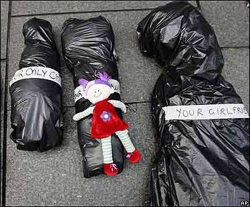 عروسکی بر روی يکی از 300 کيسه مشابه کيسه حمل جسد که برای گراميداشت ياد قربانيان درگيری های مختلف در سراسر جهان، در مرکز شهر سيدنی پايتخت استراليا به نمايش گذاشته شده است.