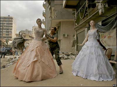 يک زن لبنانی در حال تميز کردن لباس های عروسی در جنوب بيروت. اين منطقه پرجمعيت در جريان نزاع اخير، بارها توسط نيروهای اسرائيلی بمباران شده بود.