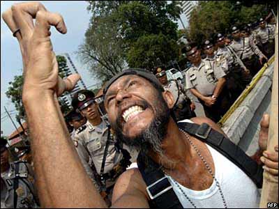 دانشجوی پاپوآيی در تظاهراتی در اعتراض به شرکت بزرگ معدنکاوری آمريکا Freepost در مقابل سفارت آمريکا در جاکارتا، اندونزی. |
