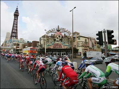 دوچرخه سواران در بلکپول، بريتانيا در بخش دوم مسابقات سراسری بريتانيا از بلکپول تا ليورپول. |
