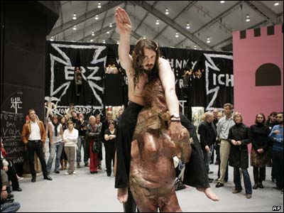 جاناتان ميس، هنرمند آلمانی در حال اجرای برنامه در موزه هنرهای معاصر در هامبورگ.