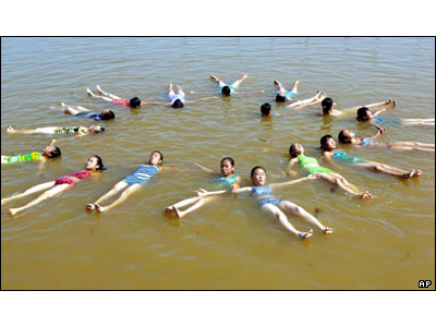 تصويری که خبرگزاری شينهوا منتشر کرده، جهانگردانی را نشان می دهد که در درياچه نمک ساخته شده توسط اين کشور شناور هستند. خبرگزاری شينهوا گزارش کرده که به دليل بالا بودن ميزان نمک، بدن انسان می تواند روی آب اين درياچه شناور شود. اين درياچه روز دوشنبه افتتاح شد.