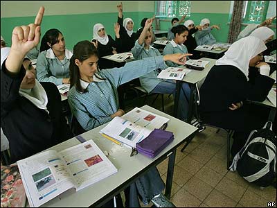 دانش آموزان فلسطينی در سومين روز باز گشايی مدارس در غزه. باوجود اعتصاب معلمان فلسطينی در اعتراض به پرداخته نشدن حقوقشان، مدارس در اراضی فلسطينی تعطپل نشده اند.