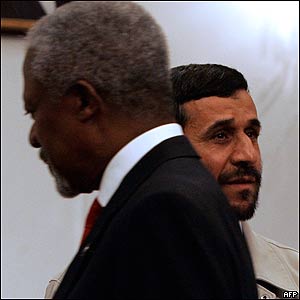 کوفی عنان، دبير کل سازمان ملل متحد در دومين روز از سفر خود به تهران، با محمود احمدی نژاد، رييس جمهور ايران ديدار کرد.