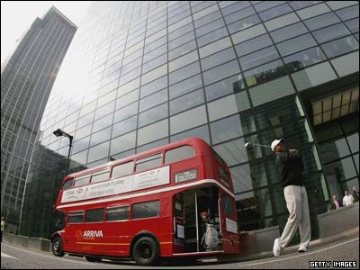 در آغاز مسابقات جهانی گلف، تايگر وودز از آمريکا در مقابل يک اتوبوس دو طبقه در لندن ديده می شود.