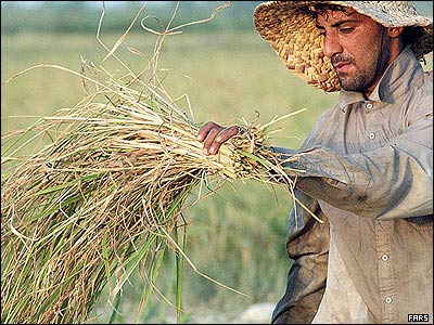 کارگر شاليکار در يک شاليزار در ايران مشغول کار