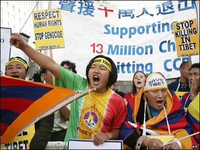 تظاهر کنندگان تبتی در لندن در اعتراض به سفر "ون جيابائو" نخست وزير چين به بريتانيا شعار می دهند.