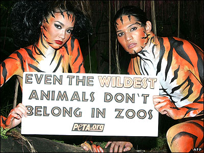 اعضای سازمان پتا در مانيل که يک سازمان غير دولتی حمايت از حقوق حيوانات است به آنچه اسير ساختن حيوانات در باغ وحش خواندند، با شعار "حتی وحشی ترين حيوانات را نبايد در باغ وحش گذاشت" اعتراض می کنند. |