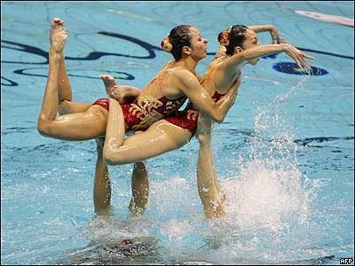 شناگران چينی در حال اجرای حرکات همزمان شنا در رقابت های جهانی اين ورزش در يوکوهاما، ژاپن.