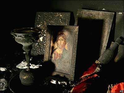 کليسای يکصد و هفتاد ساله ارتدوکس در کرانه باختری که امروز صبح زود توسط عده ای مسلمان خشمگين، در واکنش به اظهارات پاپ، به آتش کشيده شد.