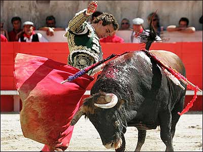 گاوباز فرانسوی در شهر نيمز در جنوب فرانسه. اين فستيوال همه ساله در آخرين روز فصل برداشت انگور در اين شهر برگزار می شود.