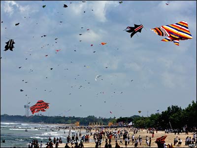 بادبادک بازی مردم محلی و جهانگردان در بالی، اندونزی. سه حمله انتحاری سال گذشته در بالی، باعث کاهش سفر جهانگردان به اين جزيره شده است. این در حاليست که صنعت جهانگردی، منبع اصلی درآمد ساکنين اين جزيره به شمار می رود.
