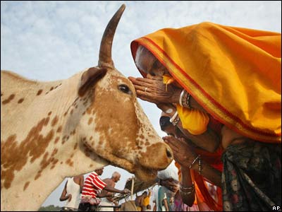زن هندو در حال دعا در برابر گاو در الله آباد هند. گاو در آئين هندو مقدس شمرده می شود.