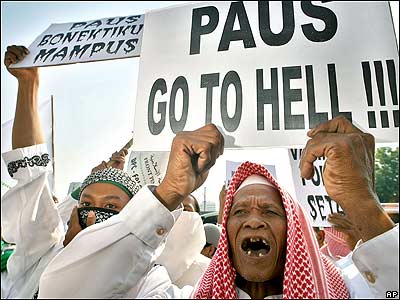 تظاهرات هواداران و فعالان گروه اسلامگرای "جبهه مدافعان اسلام" در اندونزی عليه سخنان اخير پاپ بنديکت شانزدهم درباره اسلام.