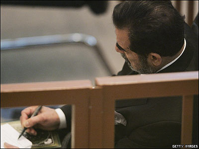 جلسه ای ديگر از محاکمه صدام حسين رييس جمهورسابق عراق در بغداد. اتهام صدام قتل عام هزاران کرد عراقی در سال 1988 است.