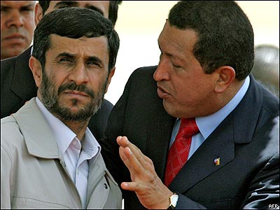 هوگو چاوز، رييس جمهور ونزوئلا (سمت راست) و محمود احمدی نژاد رييس جمهور ايران، در نزديکی کاراکاس. آقای چاوز گفت که موافقتنامه هايی در زمينه انرژی بين دو کشور به امضا رسيده است.