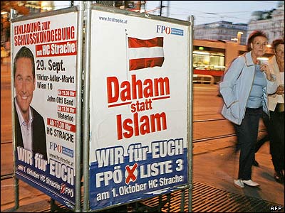پوستر تبليغاتی حزب راست افراطی FPO يا حزب آزادی اتريش در وين پايتخت اين کشور. روی اين پوستر شعار "خانه به جای اسلام" نوشته شده است.