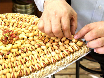 دکاندار ايرانی در حال چيدن بسته پسته. صنعت پسته در ايران سالانه 500 ميليون دلار در آمد دارد.
