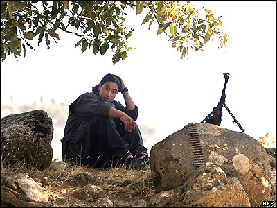 زن مسلح کرد عضو گروه شورشی پ ک ک در دامنه های کوه قنديل واقع در مرز ايران و عراق. اين گروه که برای خود مختاری در جنوب شرق ترکيه می جنگد، اعلام آتش بس يک جانبه کرده است.