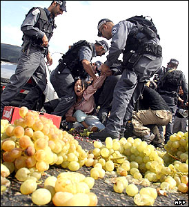 پلیس اسراییل در حال جابه جا کردن یک فعال طرفدار صلح اسراييلی. این فعالان قصد داشتند در حرکتی نمادین انگورهای دهکده فلسطينی الخضر را جمع کرده و با خود به اسراييل ببرند. قبل از محصور شدن این منطقه بوسیله دیوارهای بتونی، کشاورزان فلسطينی قادر بودند که محصولات خود را برای فروش به اسراييل ببرند اما اکنون مقدار زيادی از محصولاتشان بلا استفاده می ماند.