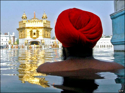 مردی سيک در نزديکی معبد طلايی امريتسار هنگام غسل در رودخانه گنگ