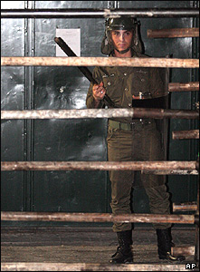 پليس ضد شورش ايران در مقابل در سفارت دانمارک در تهران. در پی نمايش کاريکاتورهايی از پيامبر اسلام در تلويزيون دانمارک، عده ای در برابر سفارت اين کشور تظاهرات کرده و به طرف آن سنگ و کوکتل مولوتف پرتاب کردند.