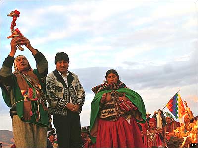 "ايوو مورالس" اولين رييس جمهور سرخپوست بوليوی در مراسم سنتی دعا برای دولت بوليوی، در خرابه های شهر مقدس تويانکو در 72 کيلومتری پايتخت آين کشور.