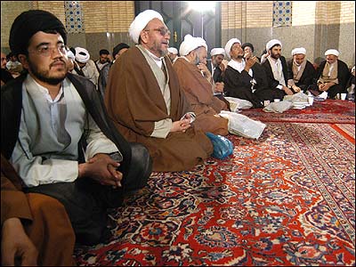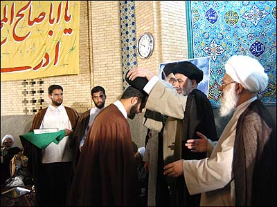 پيش از آغاز مراسم عمامه گذاری سيد مهدی (چپ) و شيخ حسين سوگند می خوردند که در راه اسلام قران قدم بردارند.