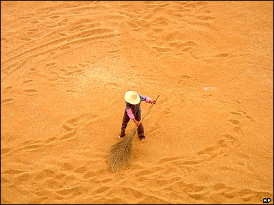 کشاورز چينی در حال خشکاندن محصولات گندم در شرق چين ايالت انهوی. چين در سال 2005 سومين کشور عمده ارائه کننده کمک های غذايی در جهان شد.