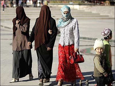زنان مسلمان چينی در منطقه خودمختار سين کيانگ در غرب چين. بيش از چهل اقليت نژادی در اين منطفه از کشور چين ساکن هستند
