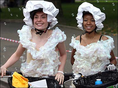 دوچرخه سواران در لندن برای شرکت در يک برنامه خيريه با پوشيدن لباسهای تزئينی مسافت بين دو کاخ سلطنتی باکينگهام و ويندزور را رکاب زدند