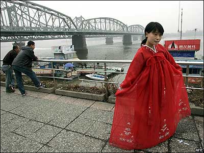 زنی کره ای با لباس سنتی کره در کنار" پل شکسته" در شهرچينی داندونگ در مرز بين کشور چين و کره شمالی که توسط نيروهای آمريکايی در زمان جنگ کره بمباران شده بود.