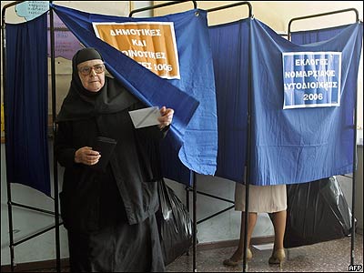 يک راهبه زن در حال خروج از حوزه رای گيری انتخابات سراسری شهرداری در يونان