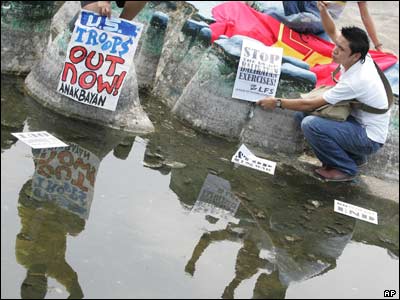 دانشجویان فيلیپینی معترض به تمرین مشترک نظامی نیروهای آمریکایی و فیلیپینی برای مقابله با نیروهای افراط گرای اسلامی