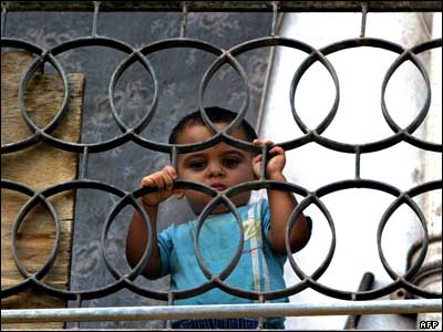 کودک عراقی در بالکنی مشرف به میدان الوتیق در بغداد. این میدان شاهد شماری بمب گزاری در ماههای اخیر بوده است