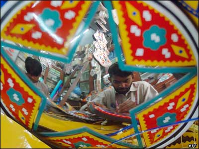 هنرمندی پاکستانی در حال تزیین داخل یک مینی بوس در کراچی. |