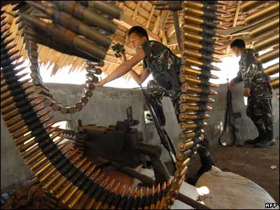 سرباز فیلیپینی در برجک نگهبانی در جزیره لازون. این جزیره پس از نا آرامیهای ایجاد شده به علت احتمال فواران آتش فشان کوهای منطقه، شاهد افزایش حملات گروهای چریکی بود